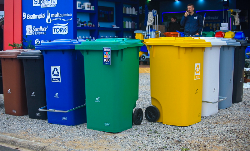 Sistema de separação de resíduos com lixeiras e sacos padronizados nas cores da coleta seletiva, atendendo sistemas de recolhimento mecânico e manual, assegurando conformidade com a legislação ambiental e promovendo a consolidação de práticas sustentáveis no ambiente corporativo.